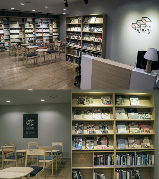 계단아래 만화방 목동점의 서가는 △마블, DC 코믹스 등의 그래픽노블 △웹툰 △영화, 드라마로 제작된 원작 만화 등의 섹션으로 꾸며져 약 2500여 권의 만화책이 구비돼 있다.