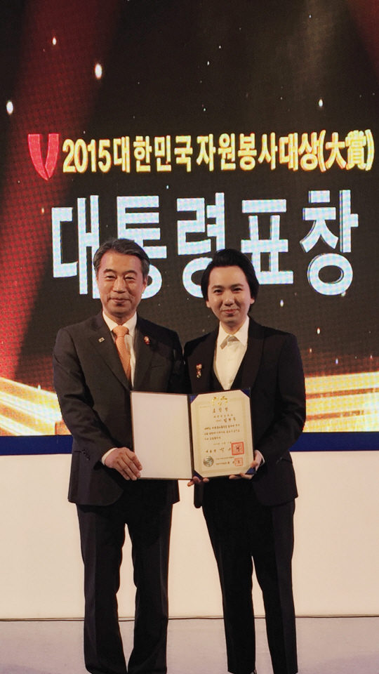 한편, 세계적 명성을 얻고 있는 한국 대표 음악가이자 팝페라테너로서 그는 그간 세계 평화와 지구촌 곳곳에 불우한 이웃들을 위해 활발한 재능나눔 및 봉사를 전개해온 공로를 인정받아 이미 앞서 언급했던 오바마 대통령상 수상을 비롯하여 지난 2010년 12월 UN본부의 'UN 평화메달'(한국인 최초 및 최연소 수상기록), 2011년 '제1회 이달의 나눔인 시상식' 보건복지부장관상, 2014년 'KBS 대한민국 나눔국민대상 시상식' 인적나눔상 및 보건복지부장관표창, 2014년 미국 캘리포니아 하원의회표창, 2015년 '제68회 세 적십자의 날' 적십자 회원유공장 명예장 등을 수상하기도 했다.