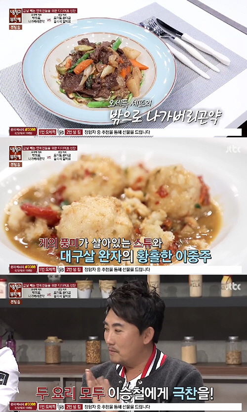7일 오후 방송된 JTBC '냉장고를 부탁해'에서는 게스트 이승철의 냉장고 속 재료로 만든 '급살 빼는 연예인들을 위한 다이어트 성찬' 대결이 펼쳐졌다.