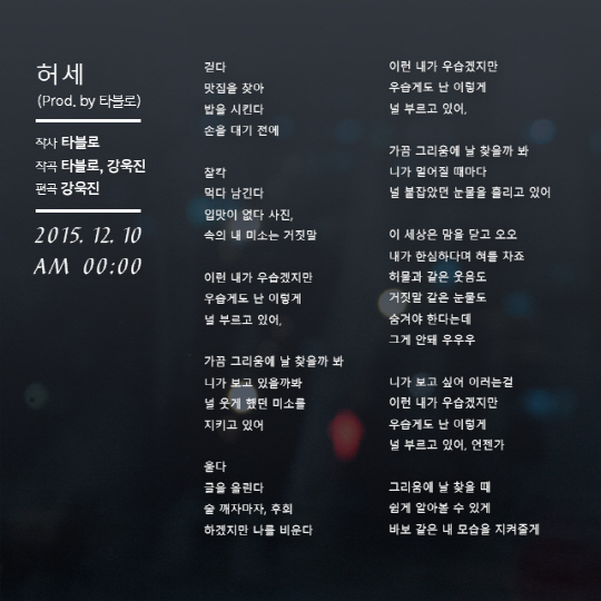 이에 윤하는 자신의 SNS를 통해 타블로가 작사, 작곡한 신곡 '허세'의 가사를 깜짝 공개해 눈길을 끌었으며, 공개된 이미지 속 가사에는 타블로 만의 진한 감성이 묻어나는 섬세한 글귀로 최근 SNS를 통해 한 번쯤은 경험해봤을 '허세'에 대한 내용이 담긴 가사로 많은 이들의 공감을 이끌어내며 신곡에 대한 기대감을 높이고 있다.
