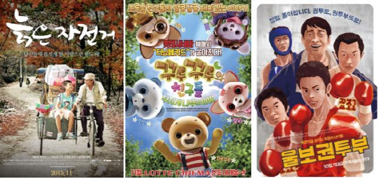 [스포츠조선 고재완 기자] 영상물등급위원회(위원장 이경숙, 이하 영등위)는 2015년 4/4분기 '청소년을 위한 좋은 영화'로 극영화 부문 '늙은 자전거', 다큐멘터리 부문 '울보 권투부', 애니메이션 부문 '꾸루꾸루와 친구들: 무지개 나무의 비밀'등 3편을 선정했다.