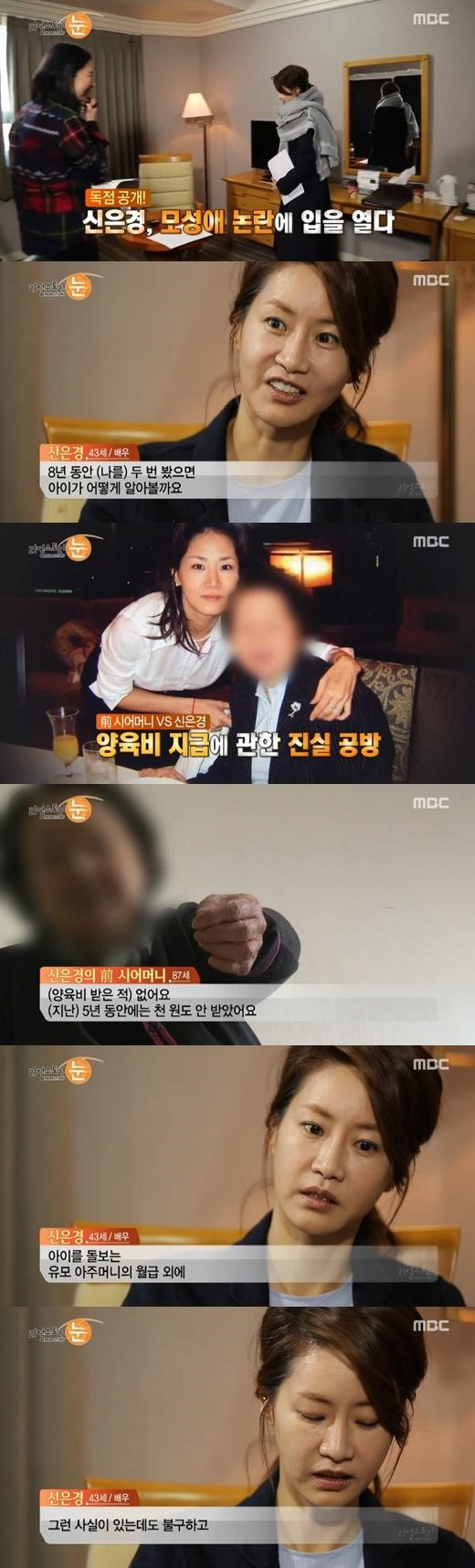 이날 신은경의 전 시어머니는 아들과 신은경이 이혼(2007년) 한 후 손자(12)를 돌보고 있다고 했다. 또한 지난 8년 동안 신은경이 단 두 번만 아들을 보러 왔다고 했으며, 최근 5년 동안 양육비도 주지 않았다고 밝혔다.
