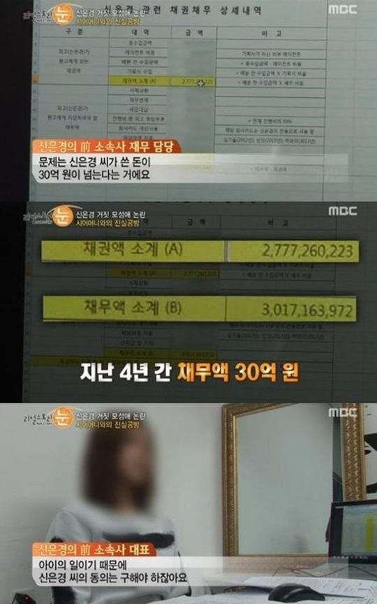 이날 방송에서 신은경 전 소속사 재무 담당자는 "신은경 씨가 지급 받은 출연료 중 (신은경) 몫이 27억 원이다"라며 "문제는 신은경씨가 쓴 돈이 30억 원이 넘는다는 거다"라고 증거 자료를 공개했다. 또한 전 소속사 측은 신은경이 1억 원 상당의 해외여행을 다녔고, 아들 양육비로 2년 동안 한 달에 150만원 가량을 보냈다고 했다.
