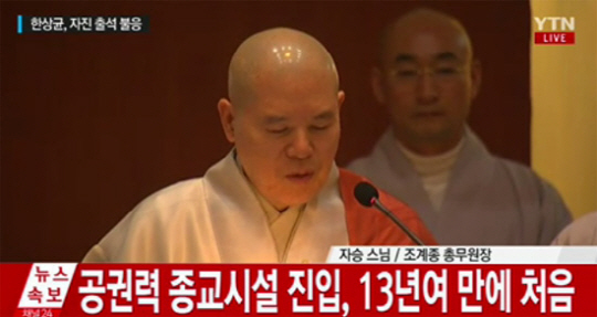앞서 이날 오후 5시 자승 스님은 기자회견에서 "내일(10일) 정오까지 한상균 위원장 거취 문제를 해결하겠다. 경찰과 민주노총은 모든 행동을 중단하고 종단의 노력을 지켜봐주시기 바란다"고 말했다.