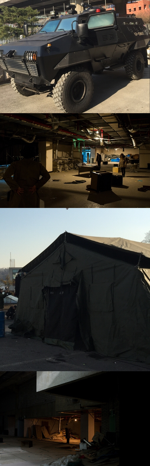 SBS가 공개한 '런닝맨' 촬영 현장에는 장갑차와 대형 군용 막사가 등장하고, 폐허가 된 어두침침한 건물 내부에 좀비 분장을 한 보조 출연자들의 모습이 보인다.