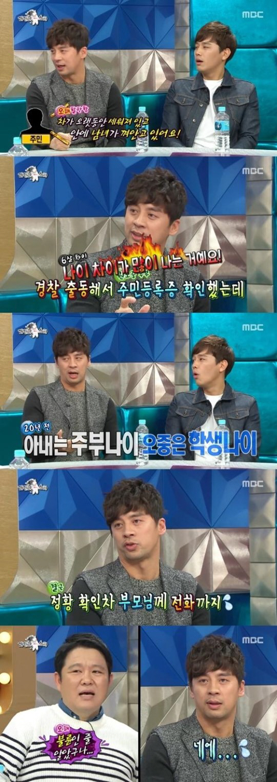 권오중은 "경찰이 주민등록증을 확인했는데 아내와 내가 나이 차이가 너무 많이 나는 거였다. 아내는 당시 주부 나이였고, 나는 학생 나이였다"며 "결국 경찰이 이상하다고 부모님께 전화까지 했다"고 말했다.