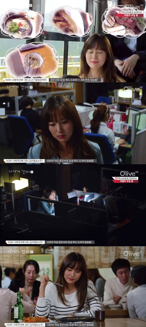 10일 방송된 올리브TV, 유맥스 드라마 '나에게 건배' 1,2회 연속 방송에서는 윤진서(라여주 역)가 시계에 맞춰 톱니바퀴처럼 일하고 일상에 치였지만 퇴근 후 요술(요리와 술)문화를 즐기며 위안을 삼는 모습이 그려졌다.