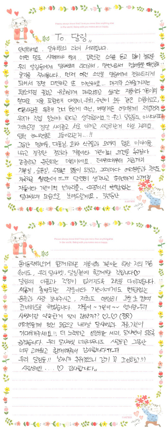 달샤벳의 리더 세리가 지율과 가은의 탈퇴소식으로 놀란 팬들에게 손편지를 공개했다.
