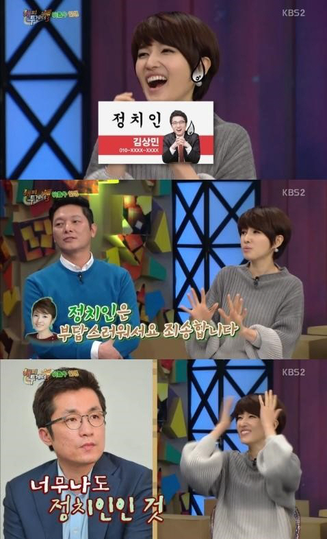 이날 김경란은 "한 어르신께서 소개팅을 주선하면서 명함을 주셨는데 정치인이었다. 그래서 경기를 일으키며 부담스럽다고 거절했다"고 말했다.