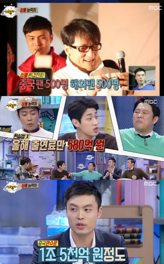 특히 박상진 씨는 "포브스가 뽑은 올해 가장 수입이 많은 배우 1위가 로버트 다우니 주니어고 2위가 성룡이다. 성룡 1년 출연료가 580억 원이다. 총 재산은 알려진 바로는 1조 5,000억 원이라고 한다"며 성룡의 모든 것을 속속들이 알고 있어 모두의 혀를 내두르게 했다.
