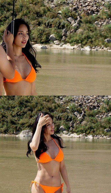 공개된 사진 속 조정민은 주황색 한뼘 비키니를 입고 터질듯한 볼륨 몸매를 자랑하고 있어 남성 팬들의 시선을 사로잡았다.