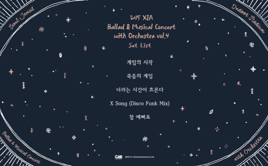 씨제스 엔터테인먼트는 "14일 오전, JYJ의 공식 페이스북 (http://www.facebook.com/CJESJYJ)을 통해 김준수의 연말 공연 셋리스트의 일부를 공개했다. 셋리스트가 공개되자마자 팬들의 폭발적인 반응이 이어졌고 김준수의 콘서트에 대한 기대감이 한껏 고조되고 있다"고 전했다.