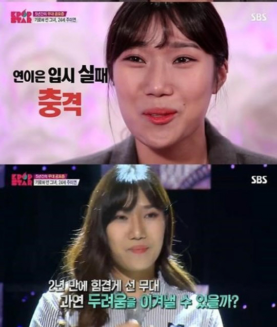 이날 순간 최고 시청률을 선보인 주인공은 'K팝스타5' 도전자 주미연이다. 주미연은 "고등학교 때는 남들 앞에서 노래하는 것을 좋아했다. 하지만 입시에 실패한 후 남들 앞에서 노래하는 게 평가받는 것 같고 두렵다. 외모 콤플렉스도 있어서 더 커진 것 같다"며 무대공포증에 대해 언급했다.
