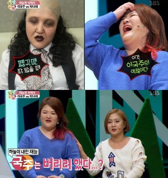 박나래는 "나도 분장에 자신감이 있고 철학도 있지만 이국주를 보고 재능이 있다고 생각했다"며 이국주의 펭귄맨 분장을 보고 "이국주가 그 당시 남자친구가 있었다. 그 모습을 보여주기 싫었다보더라"고 폭로했다.