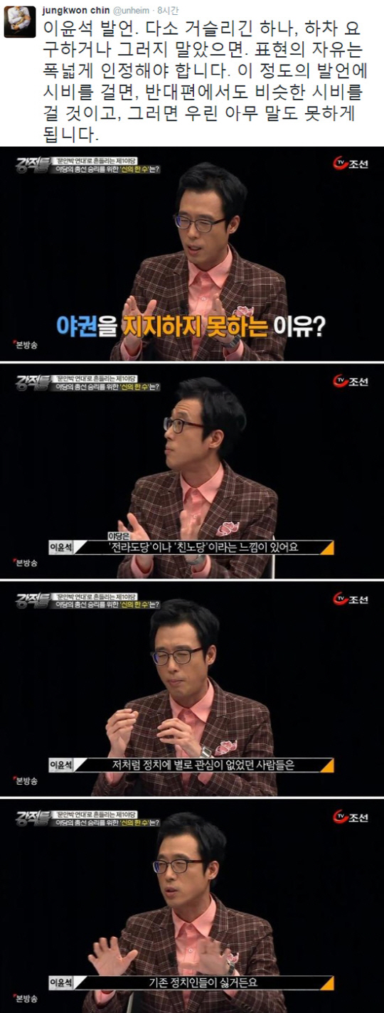 방송인 이윤석이 야당 관련 발언으로 논란에 휩싸인 가운데, 진중권이 자신의 견해를 밝혔다.