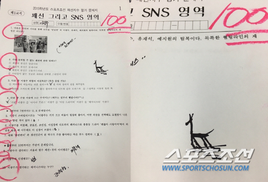 이광수는 2015학년도 스포츠조선 패션지수 평가 문제지를 보고 굉장히 반가워했습니다. 시험지를 받아든 스타들은 모두 학창시절의 추억을 만난 듯 신나하는 것 같아요.