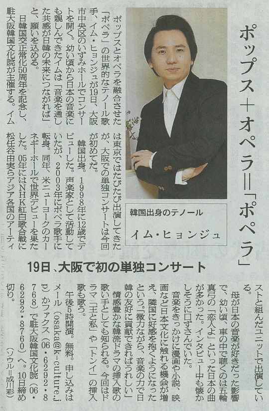 임형주, 19일 오사카서 독창회 개최. 아사히 신문에 소개되며 日 3대 일간지 대서 특필 기록 수립