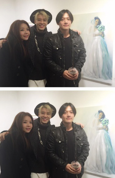 사진에는 과거 젝스키스로 활동할 당시와 다를 바 없는 꽃미남 비주얼을 자랑하는 강성훈과 훈남 이재진의 모습이 담겨 있다. 이재진이 직접 그린 여동생 이은주의 웨딩드레스 그림 앞에서 포즈를 취한 두 사람은 환한 미소를 지으며 여전한 우정을 드러냈다. 또 일본에서 가수로 활동 중인 강성훈의 동생 강윤지는 이국적인 미모를 뽐내 시선을 끈다.