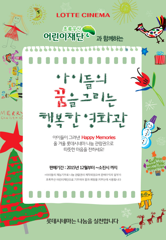 [스포츠조선 고재완 기자] 롯데시네마(대표 차원천)는 2015년 연말을 맞이하여 따뜻한 마음을 나누기 위해 초록우산어린이재단관 함께 한정판 '나눔관람권'을 출시했다.