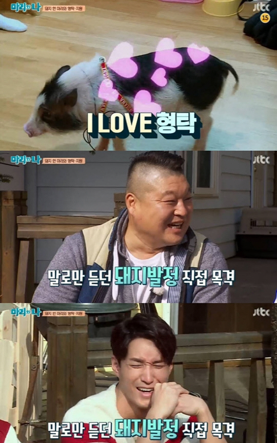 16일 오후 첫 방송된 JTBC 신규예능프로그램 '마리와나'에서 은지원과 심형탁이 애완돼지 애뀨와 첫 만남을 가지는 모습이 그려졌다.