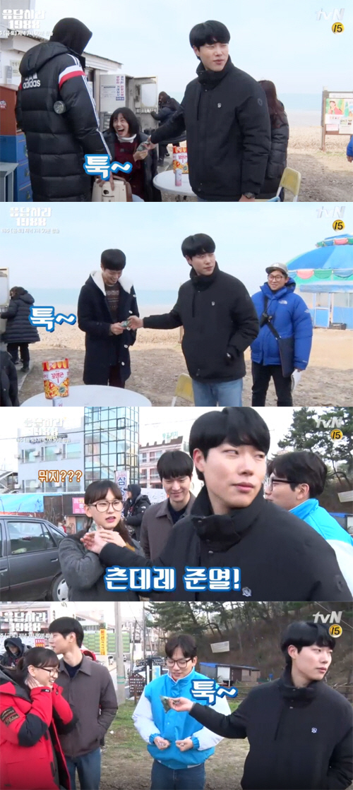 류준열은 17일 제작진이 공개한 '응팔' 촬영장 뒷이야기 6회 영상에서 박보검, 혜리, 류혜영, 이동휘 등 동료 배우들을 일일이 찾아가, 시선을 다른 곳에 두고 손으로만 핫팩을 '툭' 던져주는 장난기를 선보였다.