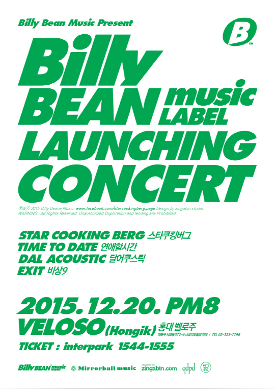 [스포츠조선 고재완 기자] 올 여름 설립된 신생레이블 빌리빈뮤직이 오는 20일 홍대 벨로주에서 레이블 설립을 기념하는 론칭콘서트를 개최한다