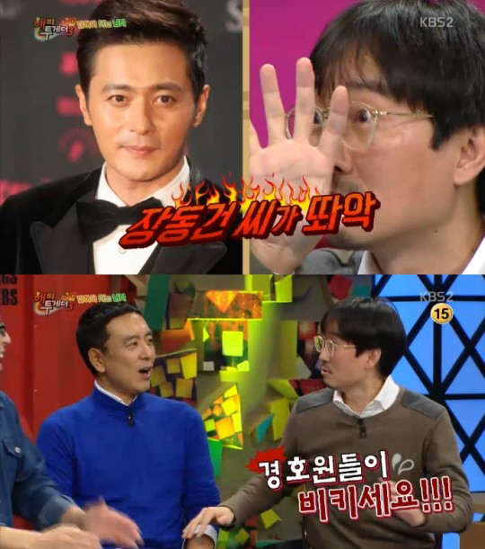 장항준은 "결혼식장으로 들어갔는데 눈 앞에 장동건이 있더라"며 "기쁜 마음에 '동건아' 하고 불렀는데 경호원들이 '비키세요'라며 날 미치더라"고 말해 현장을 폭소케 했다.