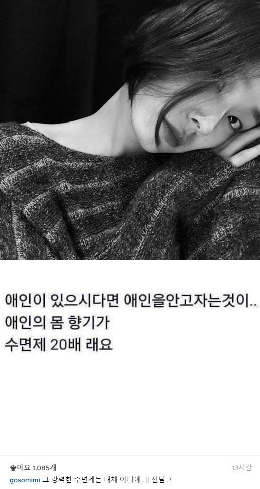 고소현은 17일 오전 자신의 인스타그램을 통해 "애인 있으시다면 애인을 안고 자는 것이.. 애인의 몸 향기가 수면제 20배래요"라는 문구가 적힌 캡처 이미지를 게재했다.