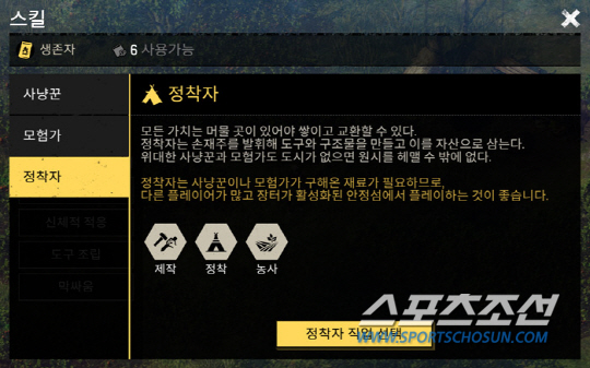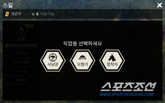 레벨10이 되면 사냥꾼, 모험가, 정착가의 큰 분류로 직군이 나뉩니다. 말 그대로 사냥꾼은 동물을 사냥하는 직업이고 모험가는 탐험, 정착가는 생활에 필요한 물건이나 도구를 제작하죠. 그런데 그 안에서도 또 특성이 나뉩니다. 모험가 중에서도 채집, 탐험, 도축. 정착자는 제작, 정착, 농사 등이죠.