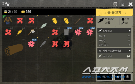 그런데 무작정 돌아다니다 보니 스테미너가 부족합니다. 초반이니 나무 열매도 따먹고 물고기도 구워먹으면서 스테미너를 유지해야 합니다. 과거 온라인게임에서 재료와 자원을 넉넉하게 모으면서 플레이 했던 습관처럼 보이는 대로 통나무도 줍고, 돌도 모으고 물고기도 잡으면서 게임을 진행했습니다.
