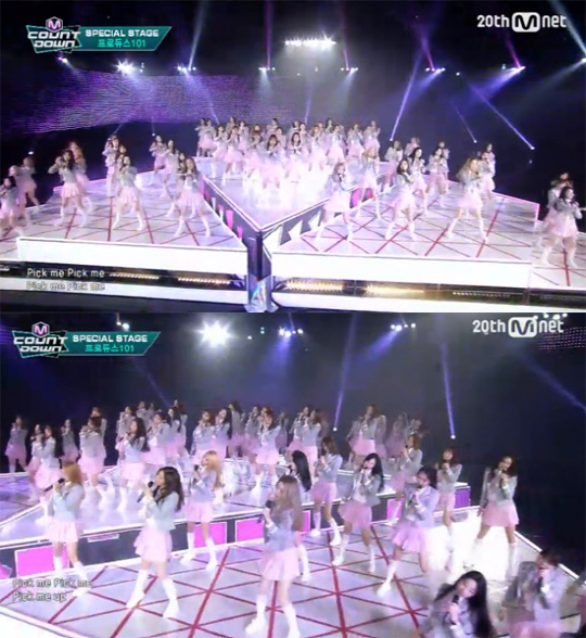 이날 98명 연습생들은 흰 와이셔츠에 재킷, 분홍색 플리츠스커트를 입고 스쿨룩으로 무대를 꾸몄다.