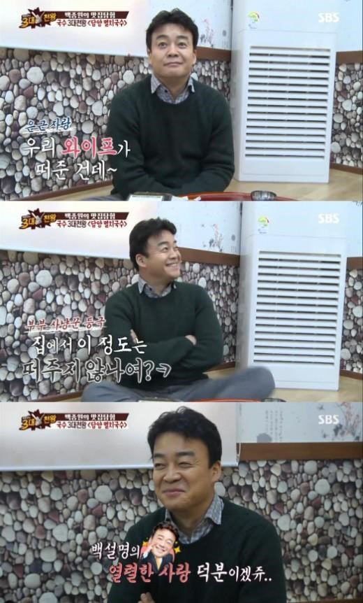이날 백종원은 자리에 앉은 뒤 자신이 입고 있는 니트를 바라보며 "아내가 만들어 준 것"이라고 자랑을 늘어놨다.