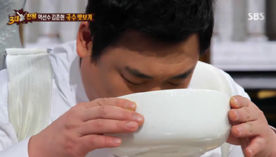 18일 오후 방송된 SBS '백종원의 3대천왕'에서는 먹선수 김준현이 등판해 담양 국수 국물을 맛보며 "콩나물 냄새도 안 나는데 진짜 진하다"고 말한 뒤 면을 들이켰다. 3초만에 면을 흡입하는 마술을 선보였다.