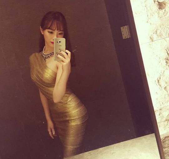 양정원은 몸에 딱 붙는 황금 드레스 차림으로 탄력 넘치는 S라인을 과시하고 있다.