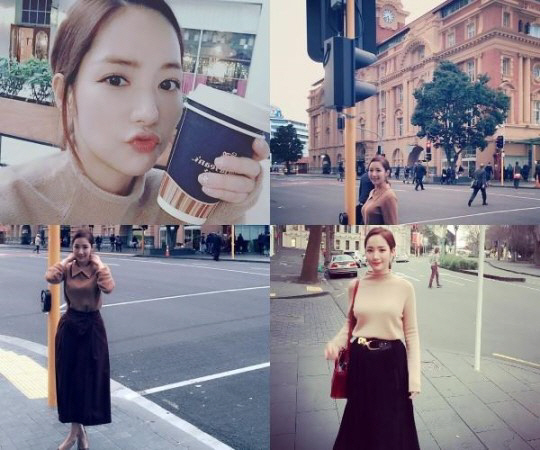 공개된 사진에서 박민영은 블랙 롱스커트와 스킨색 니트 차림으로 뉴질랜드 오클랜드 길거리를 거닐었다.