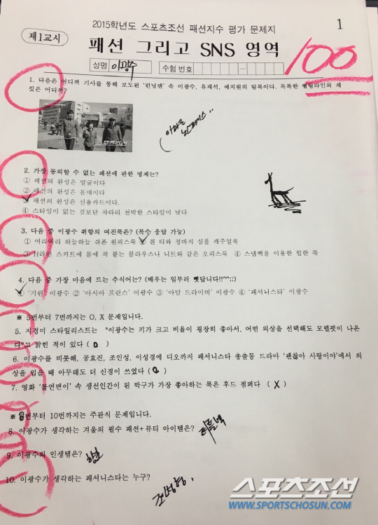 이번 패션고사에는 이들이 직접 꼽는 패셔니스타를 묻는 질문이 공통적으로 출제됐는데, 박서준은 강동원, 유아인, GD를 꼽았고, 이광수는 조인성을, 김지혜 스타일리스트는 고준희를 꼽았다. 고준희는 빅뱅 멤버 G-드래곤(GD)를 꼽았다. 크리스탈은 무난하게 "모든 사람들이 패셔니스타"라고 답했다.