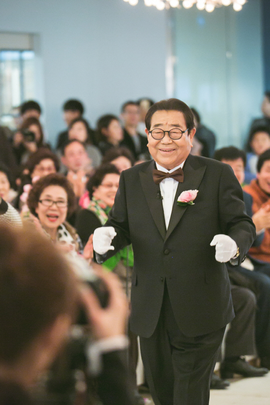 <전국 노래자랑> 악단의 연주에 맞춰 입장한 신랑 송해는 손자, 손녀 화동을 앞세워 입장하는 신부를 보자 눈을 떼지 못했다. 특히, 방송 최초로 공개되는 신부는 단아한 웨딩드레스 차림의 모습으로 등장해 하객들의 시선을 끌었으며 큰 감동을 전할 예정이다.
