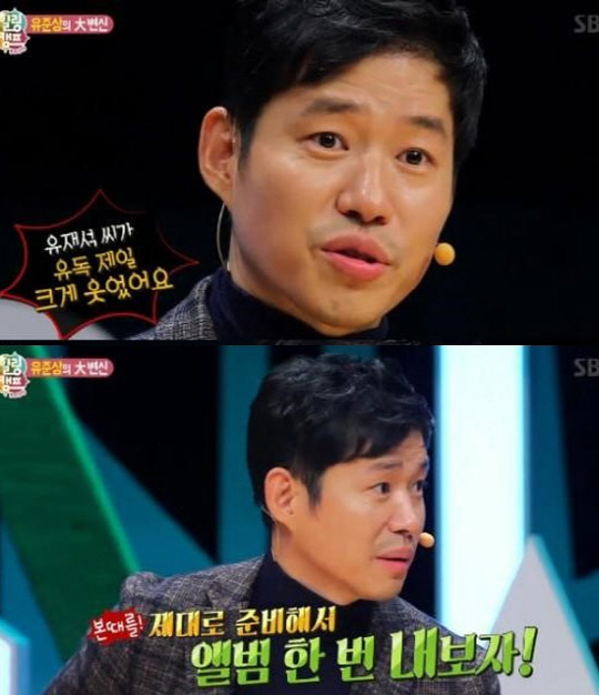 이날 MC 광희는 유준상이 "가수가 된 계기가 유재석이라고 들었다"며 운을 뗐다. 이에 유준상은 "예전에 KBS2 '해피투게더'에 나가서 자작곡을 들려줬는데 유재석이 유독 크게 웃더라"라고 이야기했다.