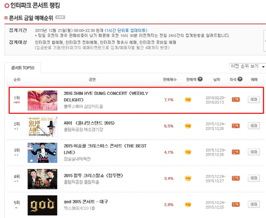 이에 21일 2월 20일부터 28일까지 4회차 공연의 1차 티켓 오픈이 진행되자 티켓을 구하고자 하는 많은 팬들의 뜨거운 관심으로 5000석 전석 매진 기록은 물론, 인터파크 콘서트 일간랭킹 1위를 차지하며 신혜성의 변함없는 인기를 증명했다.