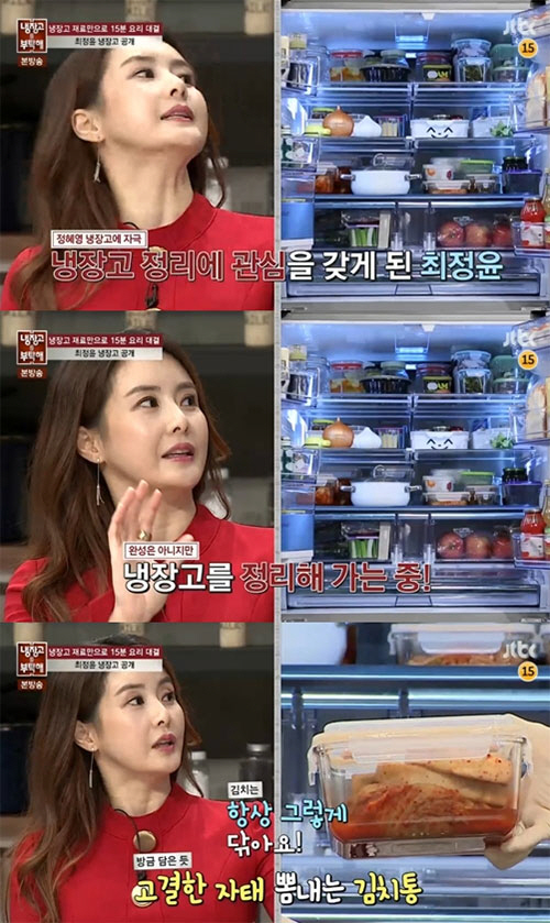 이에 최정윤은 "정혜영 씨 냉장고에 자극을 받아서 냉장고 정리에 관심을 갖게 됐다. 블로그같은 곳에서 찾아보니 설명이 잘 돼 있더라. 완성은 아니지
