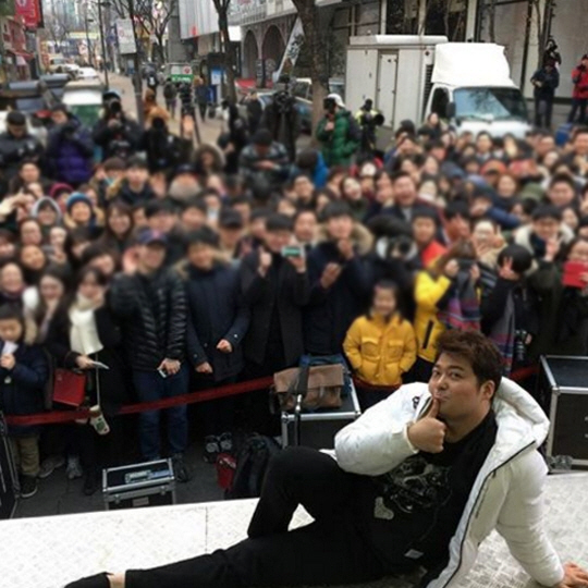 공개된 사진 속 전현무는 공개 방송 현장에 모인 청취자들과 함께 인증샷 촬영에 여념이 없는 모습이다.
