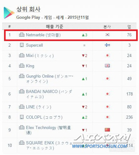 넷마블게임즈는 글로벌 모바일 앱 통계 분석 사이트 '앱애니(App Annie)'가 발표한 전세계 모바일게임 구글플레이 11월 매출 순위에서 1위를 기록했다.