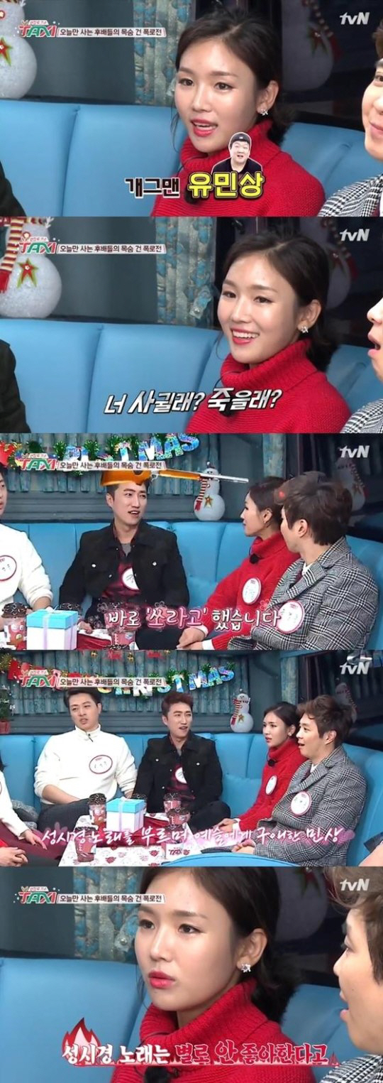 홍예슬은 "유민상 선배가 영화 보자고 문자를 보낸 적이 있다. 그래서 동기를 데려갔는데 실망하더라"며 "다음 날 삐쳐서 내 머리에 소품 총을 대더니 '너 사귈래? 아니면 죽을래?'라고 해서 '쏘세요'라고 말했다"고 털어놔 웃음을 자아냈다.