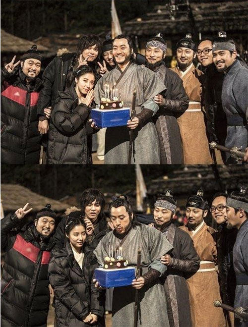 공개된 사진 속에는 신경수 감독, 생일 파티의 주인공인 박해수 그리고 유아인(이방원 역), 신세경(분이 역), 윤균상(무휼 역), 이승효(이방우 역), 서동원(이방과 역), 민성욱(조영규 역), 이준혁(홍대홍 역) 등 출연진의 모습이 담겨 있다.