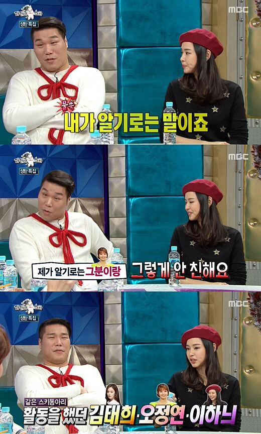 결국 김구라는 이하늬에게 "김태희, 오정연 세 사람이 다 같이 보냐?"고 질문을 던졌고, 이하늬는 "태희 언니가 연기하는 쪽이니까 자주 얘기한다"고 답했다.
