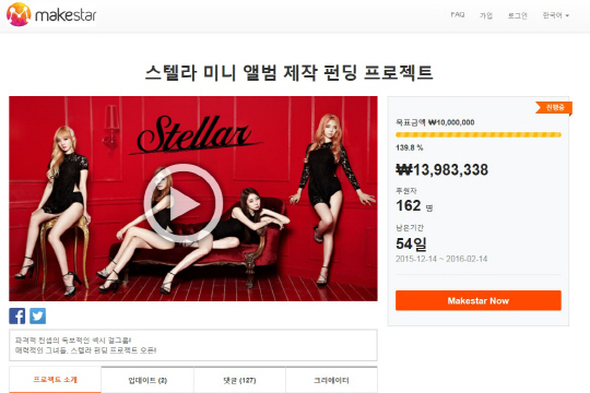 글로벌 크라우드펀딩 플랫폼 '메이크스타'는 걸그룹 스텔라의 미니앨범 제작프로젝트가 만 3일만에 목표금액 1천만원의 100%에 달성되었다고 밝혔다.