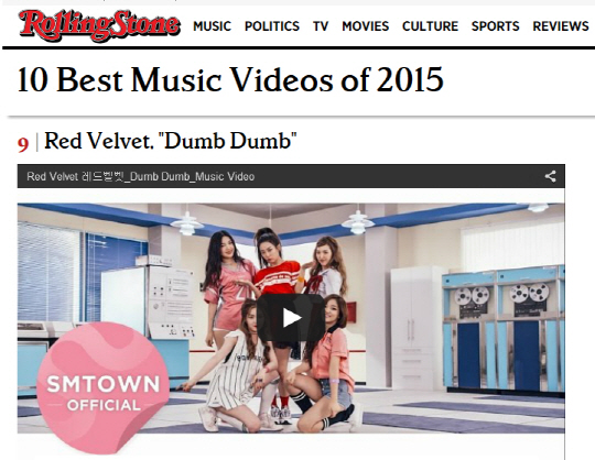 레드벨벳은 미국 유명 매체 롤링스톤지가 지난 22일(현지시각), 2015년 최고의 뮤직비디오 10편을 선정, 발표한 '2015 베스트 뮤직비디오 10'에서 첫 정규 앨범 타이틀 곡 'Dumb Dumb'(덤덤) 뮤직비디오로 아시아 가수로서는 유일하게 포함돼 눈길을 끈다.