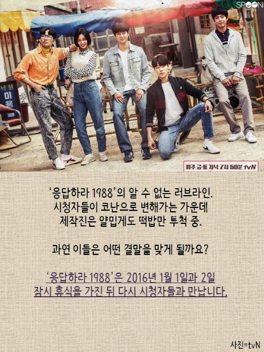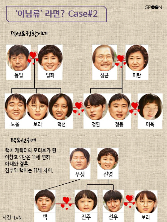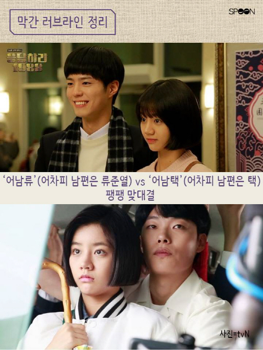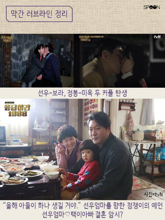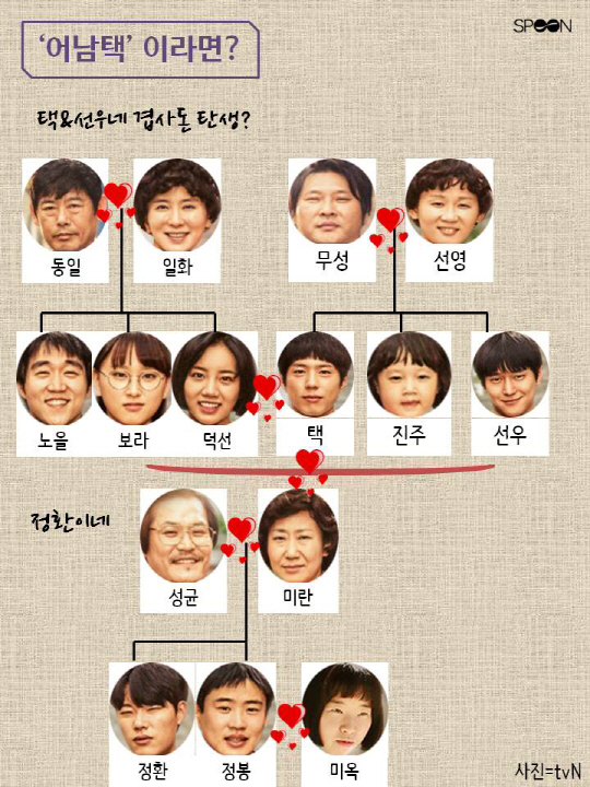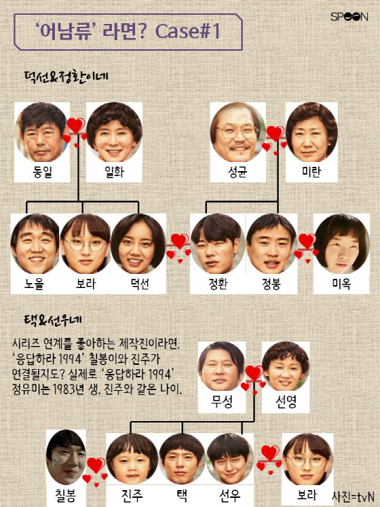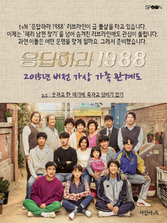 tvN '응답하라 1988' 러브라인이 급물살을 타고 있습니다. 수연(덕선, 혜리)과 택(박보검), 정환(류준열)의 삼각관계가 잠시 주춤한 사이 보라(류혜영)와 선우(고경표)의 알콩달콩 연애사가 치고 올라왔습니다. 또 택이아빠(최무성)와 선우엄마(김선영)의 러브라인도 관심사로 떠올랐습니다. 과연 이들은 어떤 결말을 맞게 될까요. 그래서 준비했습니다. '응답하라 1988' 가상 가족 관계도.