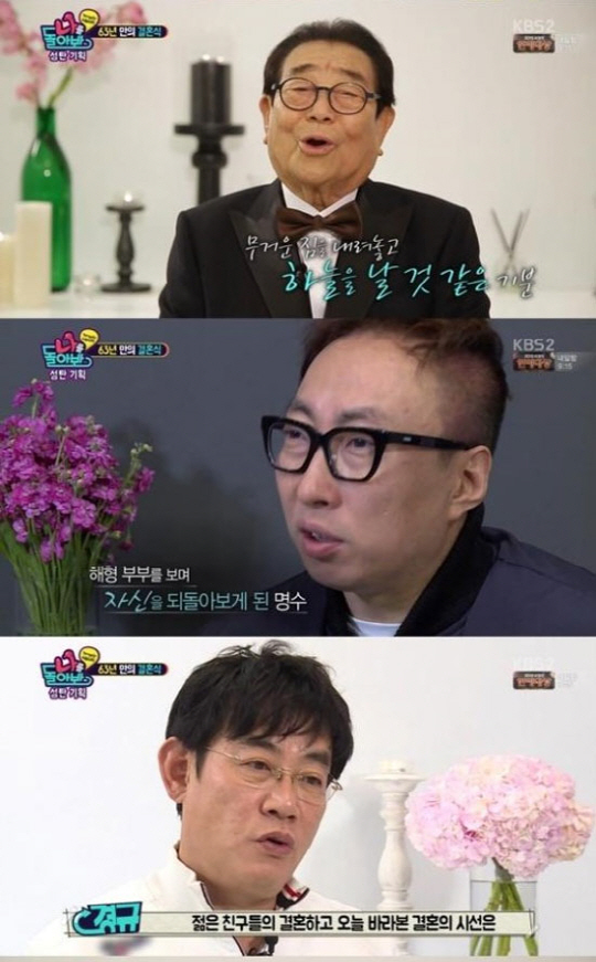 이날 송해는 결혼식 후 "드레스를 입고 앉아 있는 모습을 보면 다시 없을 미녀를 보는 것 같았다"라며, "지금 제 마음을 하늘을 날아갈 것 같다. 큰 짐을 내려 놓은 것 같다"고 소감을 밝혔다.