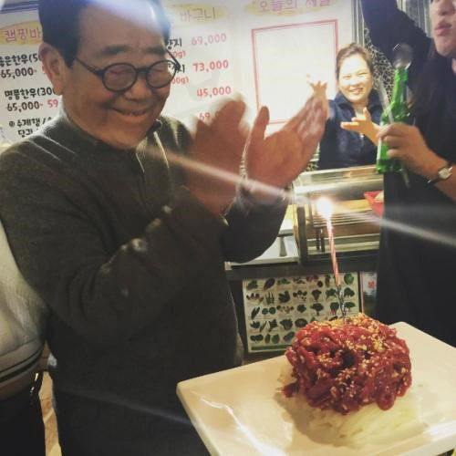 공개된 사진에서 송해는 육회로 만든 케이크에 초를 밝히고 환하게 웃고 있다. 특히 박수를 치며 아이처럼 기뻐하는 모습이 눈길을 끈다.